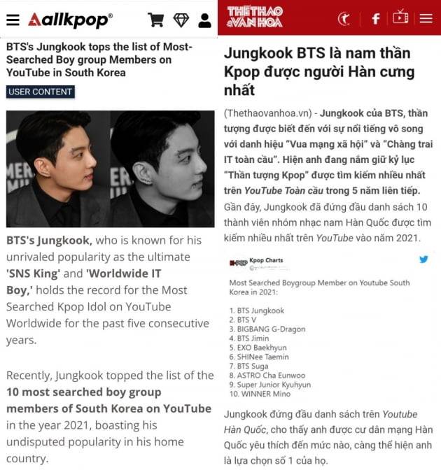 'thethaovanhoa' 또한 정국은 전세계 유튜브 최다 검색 K팝 아이돌 기록을 '5년 연속' 보유하고 있다고 말하며 '소셜 미디어 제왕' 이라는 타이틀로 독보적인 인기를 누리고 있는 인물로 정국을 소개했다.
