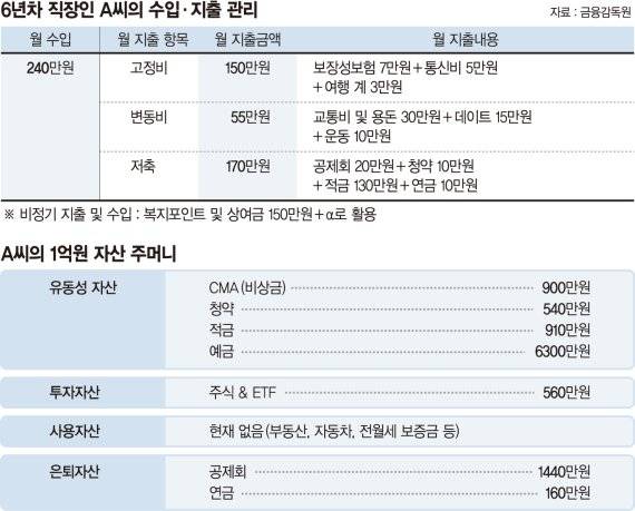 A씨의 월 세후 소득은 240만원이다. 보장성 보험 7만원과 통신비 5만원, 여행 계 3만원 등 고정비는 15만원이다. 데이트 비용 15만원, 교통비 및 용돈 30만원, 운동 1만원 등 변동비는 55만원이다. 공제회 20만원과 청약 10만원, 적금 130만원, 연금 10만원 등 월 저축액은 170만원이다.