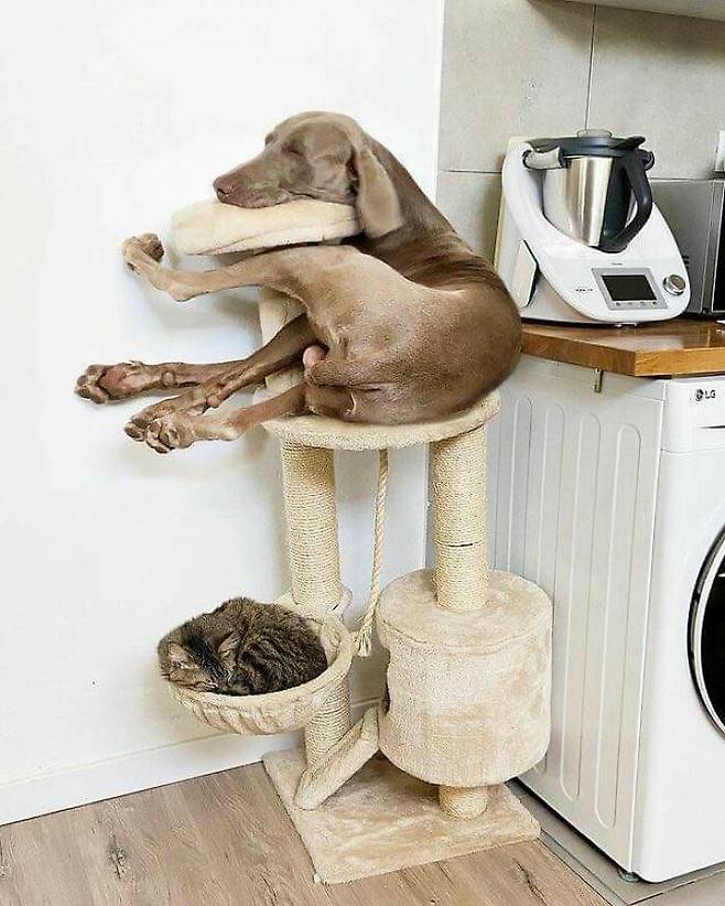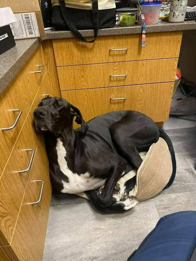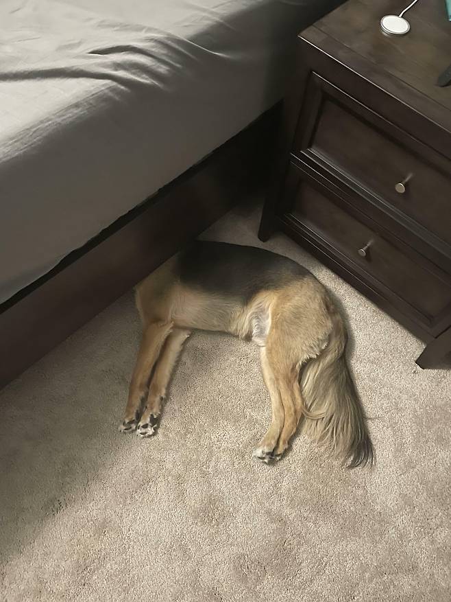 '우리 개는 새 침대에 예전처럼 들어 갈 수는 없지만, 노력하는 개 입니다.'