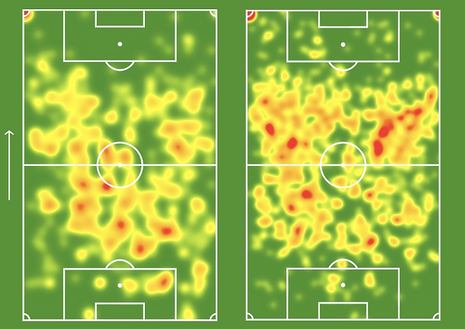 이처럼 황인범은 제니트, 스파르타크 등 강팀을 만날 때는 자기 진영 깊숙한 곳까지 내려앉아 후진 배치돼 팀 수비진을 두텁게 해주며 역습 기회를 노리는 역할에 집중하지만, 루빈 카잔이 객관적인 전력에서 밀리지 않는 상대를 만났을 때는 적극적으로 전진해 공격 진영에서 팀이 경기를 주도하는 데 앞장서고 있다. 다음 그림 중 왼쪽은 황인범이 팀 전력에 지나치게 떨어지며 수비를 하는 데만 집중하느라 자신의 공격적인 재능을 발휘하는 데 어려움을 겪은 밴쿠버 화이트캡스 시절(2020 시즌), 오른쪽은 그가 지난 시즌(2020/21) 공수 균형이 고르게 잡힌 루빈 카잔에서 선보인 움직임을 보여주는 히트맵이다.