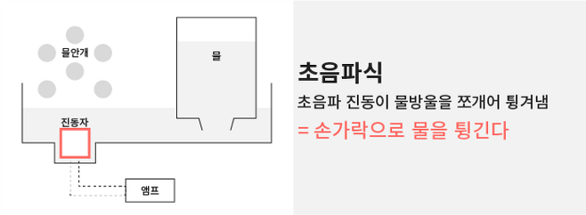 초음파 진동으로 물방울을 아주 작게 쪼개어 튕겨내는 방식으로 손가락으로 물을 튕겨내는 것과 유사합니다.