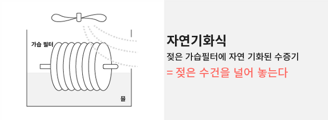 물에 젖어 있는 가습필터에 바람을 불어 자연 증발하는 수증기를 분사하는 방식으로 방안에 젖은 수건을 널어 놓고 선풍기를 작동시키는 것과 유사합니다.