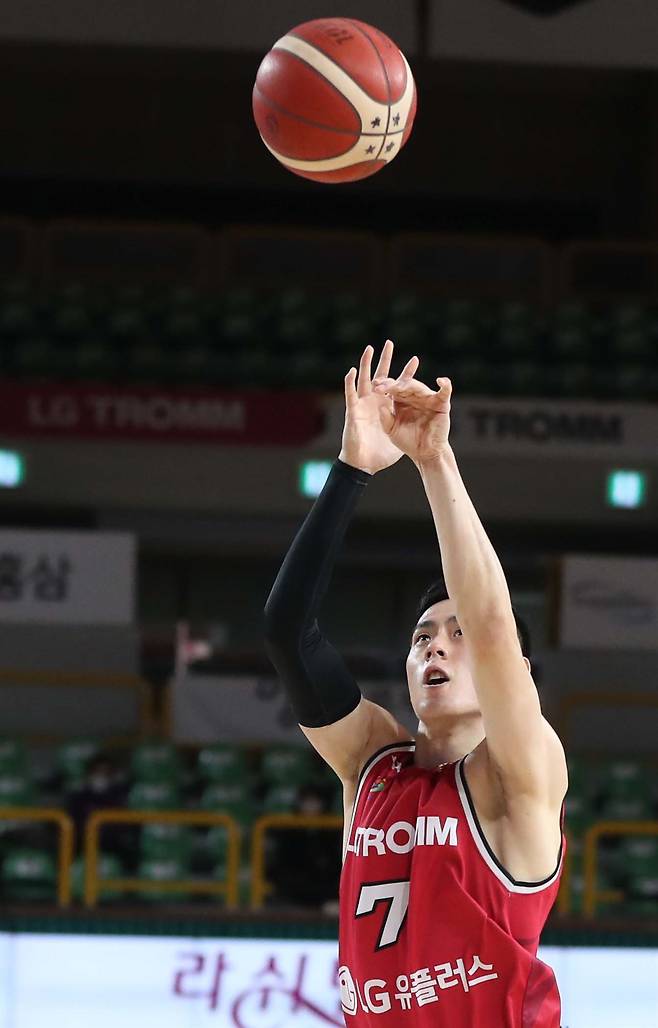 | ▲ 25일 경남 창원체육관에서 열린 '2021-2022 KGC인삼공사 정관장 프로농구' 창원 LG 세이커스와 고양 오리온 오리온스 경기. LG 이관희가 슛하고 있다. |