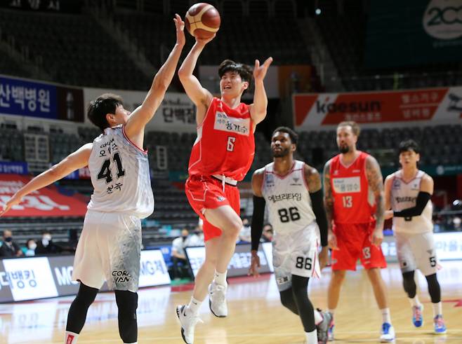 | ▲ 12일 경기도 고양체육관에서 열린 프로농구 고양오리온-안양KGC인삼공사 경기. 오리온 이정현이 슛하고 있다. 2021.10.12 |