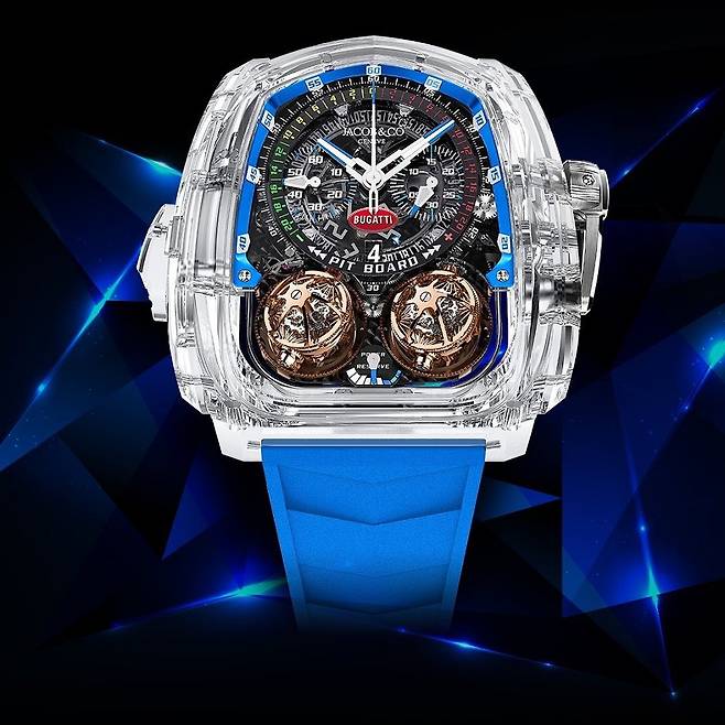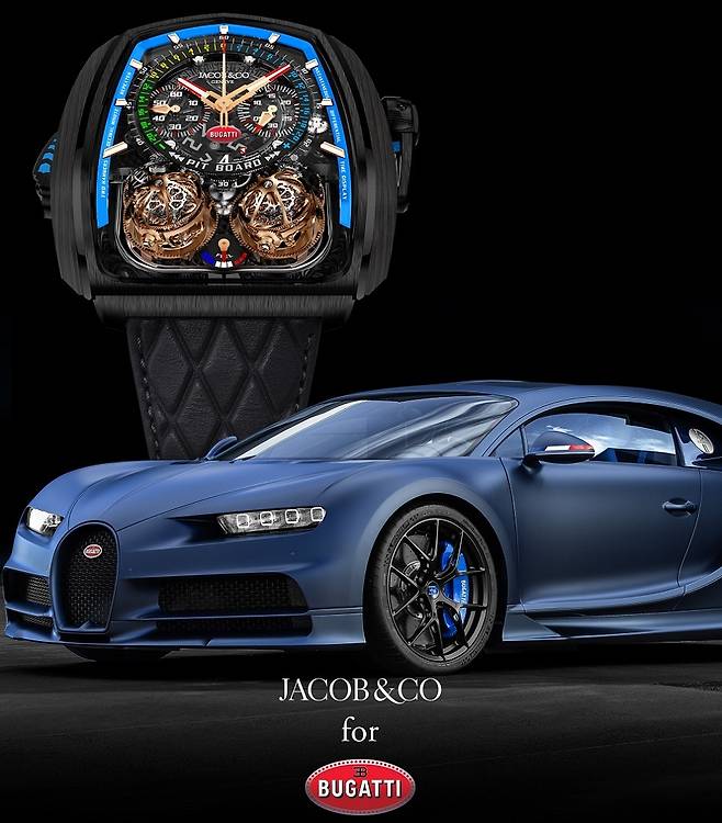부가티 시론 투르비용 _ 부가티의 상징과도 같은 16기통 엔진을 형상화한 역동적인 애니메이션 다이얼과 30º가량 기울어진 플라잉 투르비용 케이지를 부가티 시론의 날렵한 차체를 떠올리게 하는 아방가르드한 케이스 및 사파이어 크리스탈 구조를 통해 드러내는 제이콥앤코의 야심작이다.
