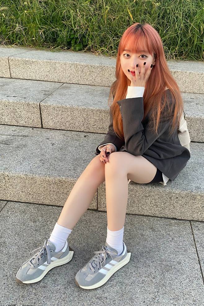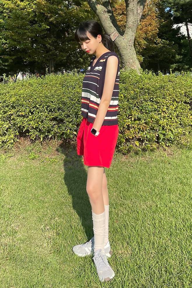 상큼발랄한 걸리시 룩에도 어울리는 스니커즈! 레드 컬러가 돋보이는 베스트와 숏 팬츠와 함께 한 모습이죠. 산뜻한 컬러 스타일링의 마무리는 그레이 컬러의 아디다스 레트로피 E5면 충분하겠죠?