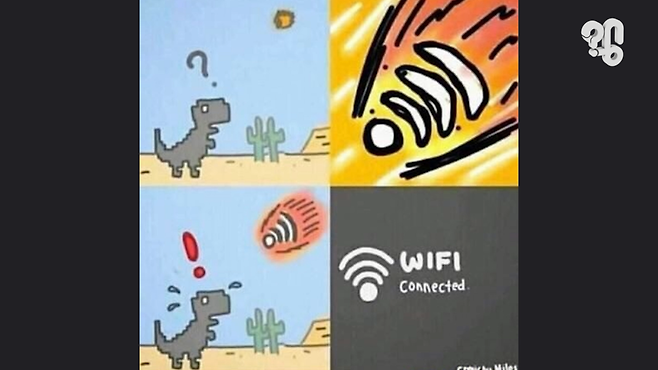 또 이건 구글의 공식 설명은 아니지만 와이파이 모양을 45도 기울이면 떨어지는 운석을 닮았는데 운석이 떨어지면 공룡이 멸종한다는 걸, 운석=와이파이, 와이파이가 생기면 공룡이 사라진다는 걸로 비유했다는 설도 있다. 또 다른 해석으로는 IP주소에 연결할 수 없을 때 뜨는 ‘DNS error’ 발음이 ‘dinosaur(공룡)’의 발음과 비슷하기 때문이라는 주장도 있다. ‘DNS error’ ‘dinosaur’ ㅋㅋ