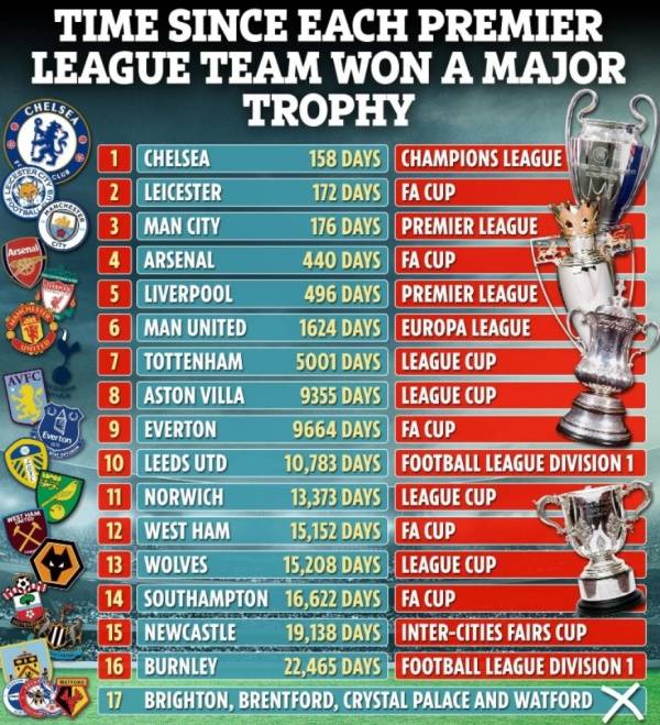 토트넘의 무관 기록 5,001일은 EPL 빅클럽들 중 가장 하위권에 속한다. 첼시는 158일(챔피언스리그), 레스터 시티는 172일(FA컵), 맨체스터 시티가 176일(EPL), 아스널이 440일(FA컵), 리버풀은 496일(EPL), 맨유 1624일(유로파리그) 순이다.
