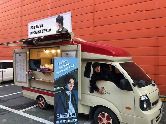 구교환은 커피차에 올라 적극적으로 포즈를 취하며 고마움을 표현했습니다.