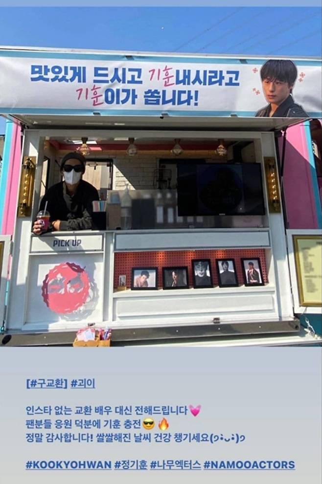 소속사 나무엑터스는 해당 사진에 “인스타 없는 교환 배우 대신 전해드립니다. 팬분들 응원 덕분에 기훈 충전”이라는 멘트를 남겼는데요.