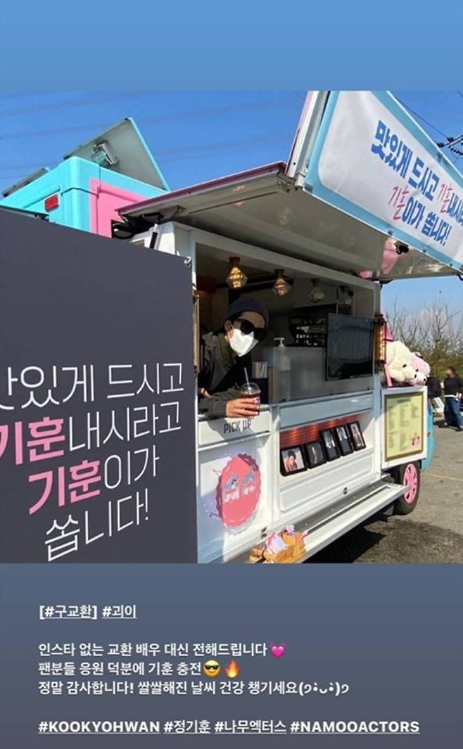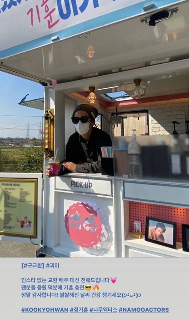 공개된 사진 속에는 팬들이 마련해준 커피차에 감동한 듯한 구교환의 모습이 담겼는데요.