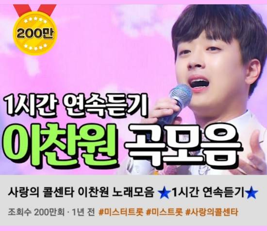 지난 2020년 9월 5일 미스&미스터트롯 공식계정 유튜브 채널에는 "사랑의 콜센타 이찬원 노래모음 1시간 연속 듣기"라는 제목의 영상이 게재됐다.