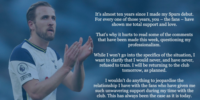 논란이 커지자 케인이 공식 입장을 밝혔다. 그는 SNS를 통해 "토트넘에 뛴 지 10년이 다 되어간다. 그 기간 동안 팬들은 나를 전폭적으로 지지했다"라고 입을 열었다.