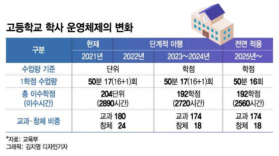 고교학점제 단계적 이행은 2023년부터 본격화한다. 올해 중2가 고1로 올라가는 2023년부터 수업량 기준을 단위에서 학점으로 전환한다. 총 이수학점은 204단위에서 192학점으로 줄인다. 192학점은 교과 174학점과 창의적체험활동(창체) 18점으로 구성한다.