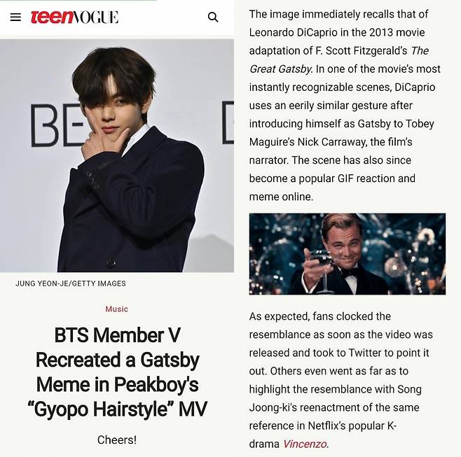 미국 틴에지 매거진 틴보그는 “방탄소년단 멤버 뷔가 픽보이의 ‘교포 헤어스타일’ 뮤직비디오에서 ‘개츠비 밈’을 재현하다”라는 제목의 기사를 통해 이를 전했다.
