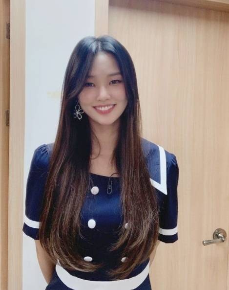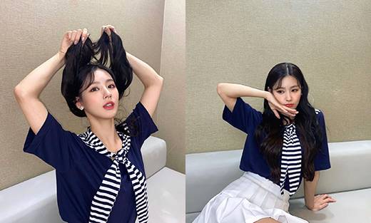미연은 네이비 컬러 티셔츠와 화이트 스커트로 청량한 마린룩을 완성했다.