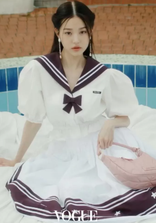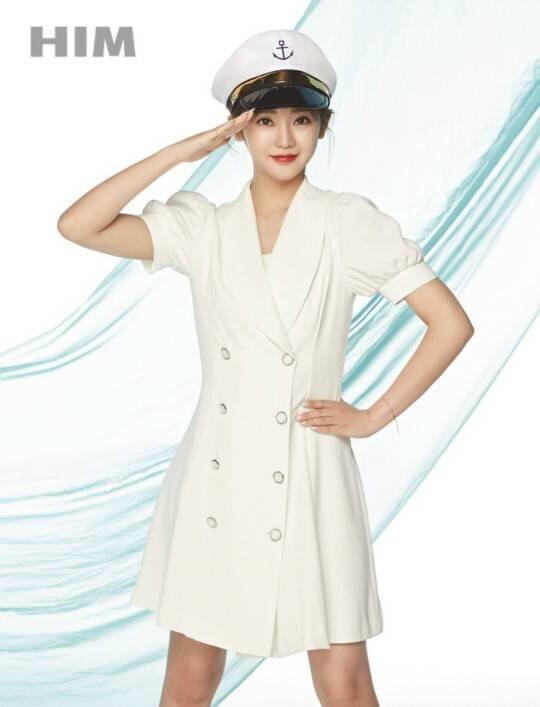 홍지윤은 새하얀 원피스의 마린룩을 소화했다.