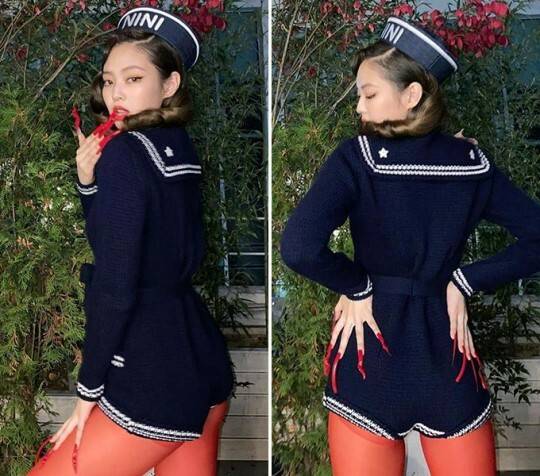 블랙핑크 제니는 화보를 통해 네이비색 보디 슈트에 강렬한 빨간 스타킹과 아찔한 메리제인 하이힐을 신었다.