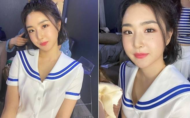 최근 유나는 마린룩을 입고 무대에 오르기 전 헤어메이크업을 하고 있는 모습을 깜짝 공개해 남심을 설레게 했다.