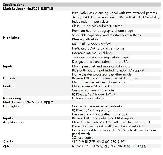 현재까지 발매된 마크레빈슨의 5000번대 제품 라인업은 디지털과 아날로그로 이루어진 소스기기 2종과 프리 앰프, 파워 앰프, 그리고 인티앰프로 구성되어 있다. 이 중에서 오늘 리뷰의 주인공인 5206프리와 5302파워는 가장 최근에 발매가 되었는데, 이 두 모델의 발매를 끝으로 5000번대 라인업이 견고하게 완성된 것으로 여겨진다. 각각의 모델명과 외형을 살펴보면 다음과 같다.