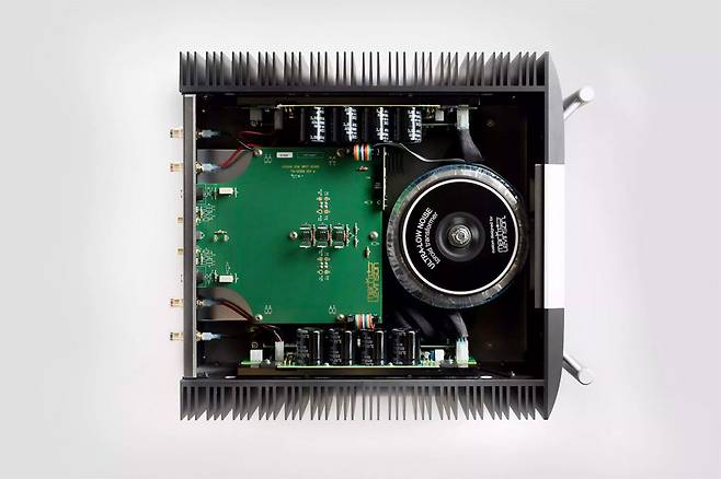 그 외에도 회로기판 자체를 분리시켜 원천적으로 컨트롤 신호나 디지털 신호가 아날로그 신호와 간섭되는 현상을 원천적으로 차단해 주고 있다. 내부 사진을 살펴보면 디지털 회로 기판은 아날로그 기판에 가려져서 직접적으로 노출되지 않고 있는 상황인데, 아날로그 회로 기판과 별도로 분리된 기판으로 아랫층에 배치되어 있는 상황이다. 디지털 기판 외에도 전원부도 독립적으로 분리하여 배치함으로써 노이즈 유입에 대한 대책이나 신호 간섭에 대해 적극적으로 대처하고 있다는 인상을 준다. 특히 전원부의 경우 3중 쉴딩 구조로 싸여져 있는 트로이덜 트랜스 부는 레이아웃을 나누는 스틸 쉴드와 알루미늄 쉴드에 의해 분리되고 쉴딩됨으로써 꼼꼼하게 차폐가 되고 있는 점도 상당히 인상적이다. 쉴딩된 전원부는 듀얼 파워 디자인으로 구성되어 있으며, 디지털을 위한 스위칭 파워부와 아날로그 회로부를 위한 리니어 파워부로 각각 나누어져 있는 것도 고가 라인업 제품 못지않은 배려로, 이 가격대의 제품에서는 찾아보기 힘든 상당한 물량 투입이 된 제품이라고 말씀드릴 수 있겠다.
