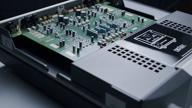 이어서 제품 내부를 살펴보면, 전면부에 제품의 레이아웃을 설명해주는 그림을 확인할 수 있으며, 그림에 따르면 좌/우 채널이 구분되어 PurePath 오디오 신호가 처리되는 것을 알 수 있다. 후면 외관에서 짐작했듯이 내부 아날로그 회로는 Dual-Monaural 구조로 A Class 아날로그 회로 디자인 형태로 제작되어 좌우 대칭구조를 가지게 된다. 오디오 회로부의 최종 출력단 쪽에는 릴레이 부품이 배치되어 입력부에서 선택된 입력단에만 선택적으로 폐회로를 구성하도록 회로를 차단시켜 연결이 해제되도록 하고 있다. 이를 통해 회로간의 간섭을 최소화하고 신호의 순도를 높일 수 있는 장점이 있어 보이며 크로스톡 측면에서도 좋은 결과를 기대해 볼 수 있는 디자인으로 생각된다. 실제로 제품을 동작하여 입력을 전환하게 되는 경우 릴레이가 붙었다가 떨어지는 소리가 들리는 상황이 조금은 거슬렸던 측면이 있는데, 제품 설계사상을 이해하고 나니 최적의 성능을 위한 설계라는 점이 수긍이 되면서 조금은 불편했던 마음이 되려 신뢰감이 가는 부분으로 변화되는 느낌이 들었다.