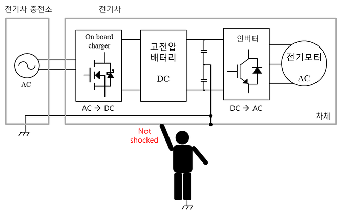 사람이 전기로부터 감전이 되려면 전기가 흐르는 경로(loop)가 사람을 통과해야 한다. 새가 전깃줄에 앉아있어도 감전이 되지 않는 이유는 전기가 새의 몸으로 통과하지 않고 전깃줄로만 흐르기 때문이다. 전기차역시 충전 중에 사람이 차체를 만져도 동전위(同電位)이기 때문에 사람 몸으로 전기가 흐르지 않아 감전이 되지 않는다.