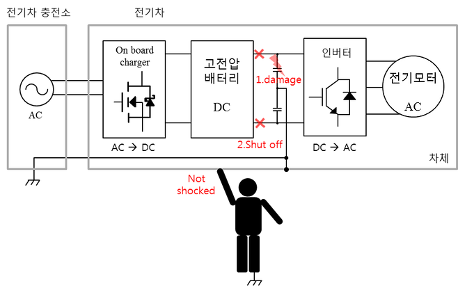 만약에 전기차 부품이 소손되어 절연파괴가 되거나 충전 중 누설 전류가 흐르면 진단을 하여 충전을 중단시키고 전력을 차단한다. 하지만, 전기차 부품에 이상이 있다면 차체를 만지는 것은 가급적 피해야 한다.