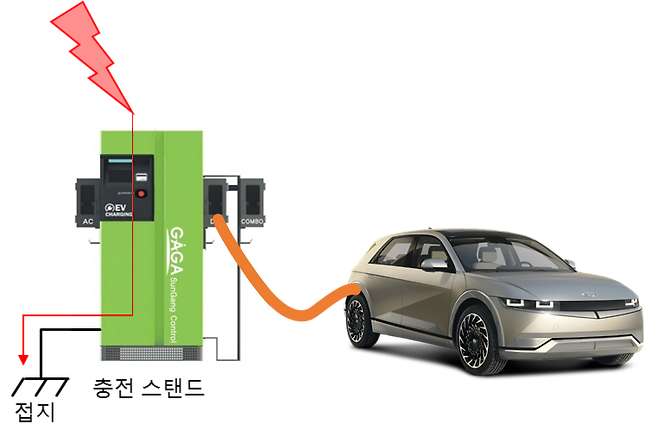 비 오는 날 전기차 충전 중에 번개를 맞을 수도 있다. 접지 설계가 제대로 되어 있다면 번개로 인한 전기는 접지를 통해 땅으로 흘러내려가야 한다. 하지만 충전 스탠드의 접지가 제대로 되어 있지 않다면, 전기차 부품을 소손시킬 수도 있다. 때문에 자동차 제조사에서도 번개가 치는 날에는 전기차 충전을 권하고 있지 않다.