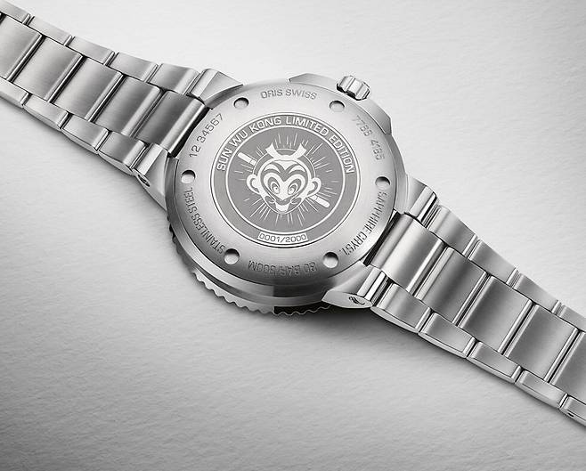 무브먼트는 셀리타의 자동 에보슈(SW 200-1)를 수정한 오리스 733 칼리버를 탑재했습니다(진동수 4헤르츠, 파워리저브 38시간). 솔리드 스틸 케이스백 형태로 무브먼트를 노출하지 않는 대신 중앙에 만화영화 속 손오공의 익살스러운 모습을 새겨 특별함을 더했습니다.