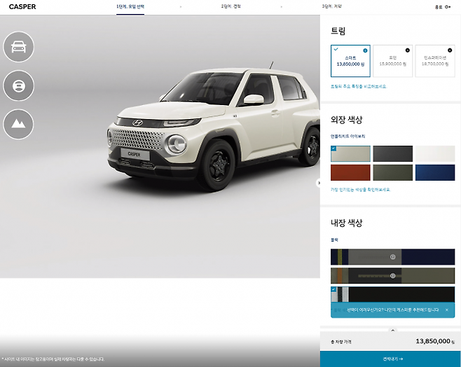 전용 웹사이트인 ‘캐스퍼 온라인’에서는 누구나 쉽게 캐스퍼 디자인을 적용해 볼 수 있다. 특히 각 항목마다 연령대 별로 가장 인기 있는 외장 색상을 퍼센트로 보여주거나 인기있는 선택 품목을 공개해 편리성을 높였다. 또 알고리즘이 나에게 맞는 캐스퍼 조합을 보여줘 보다 쉽게 항목을 선택할 수 있다. 차량의 경우 3D로 확인이 가능하지만 따로 신청을 하지 않으면 실물로 볼 수 없다는 점은 아쉽다.