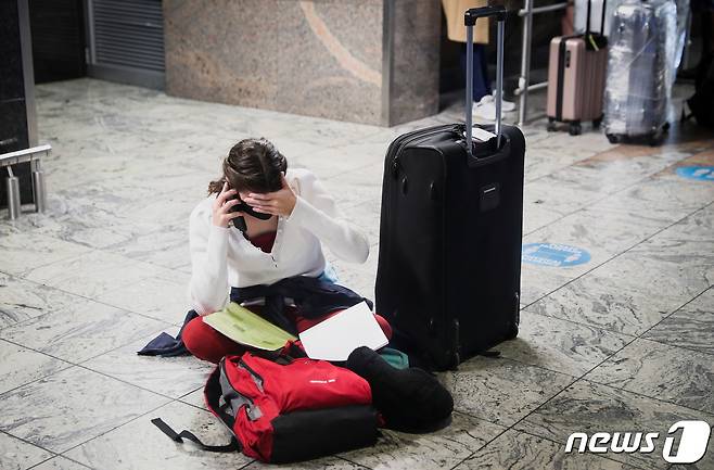 (로이터=뉴스1) 윤지원 기자 = 28일(현지시간) 남아프리카공화국을 떠나는 항공편이 운항을 중단하고 있는 가운데 요하네스버그의 OR탐보 국제공항에서 한 승객이 항공편을 찾고 있다.