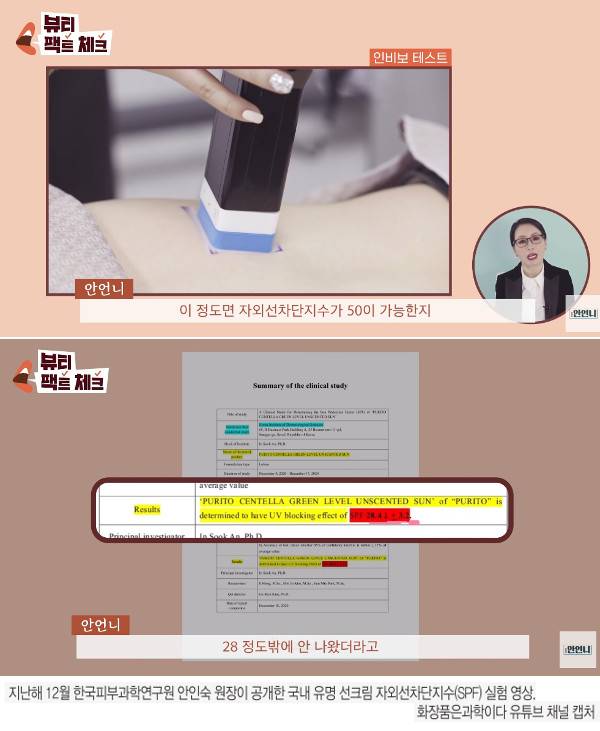 안인숙 원장은 13일 “일부 제조사는 기존 성분 자료를 바탕으로 대략적인 추정치를 내 임상기관에 의뢰했고, 임상기관은 제조사가 요청한 SPF 수치에 맞게 실험을 디자인했다”며 “(SPF 검증) 영상을 공개한 뒤 잘못된 관행 개선을 위한 많은 논의가 이뤄졌다. 현재 출시되는 선크림들은 철저한 검증을 거친 제품들”이라고 전했다.