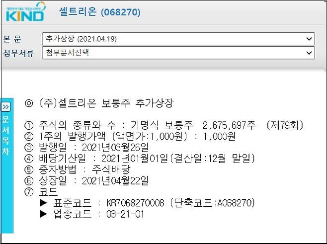또한 올해 셀트리온이 주식배당을 위해 발행한 신주가 4월 22일 상장할 때도 3영업일 전인 4월 19일 아래와 같은 추가상장 공시가 나오죠.
