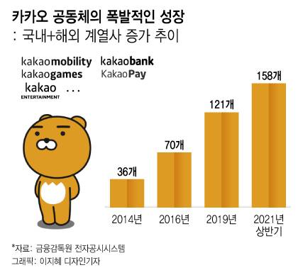 이날 카카오의 일부 사업 철수 등 상생안 발표는 문어발 확장 뿐만 아니라 김범수 의장의 오너십으로까지 정부 규제가 확대되며 급박하게 이뤄진 결정이다. 카카오의 국내외 계열사는 지난 6월 기준 158개에 이른다.