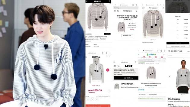 지난 12일 방송을 마지막으로 시즌 종료된 방탄소년단 자체 예능 프로그램 '달려라 방탄'에서 지민이 입고 활약한 고가 디자이너 브랜드 JW 앤더슨(JW ANDERSON) 후드 티셔츠도 공식 홈페이지와 'MILAN STYLE', 'HERVIA', 'LYST' 등 총 11개의 판매처에서 전 사이즈가 완판됐다.