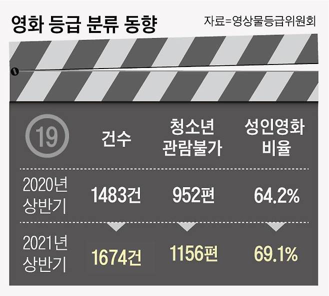 올해 상반기 결산 자료를 발표한 영상물등급위원회(영등위)는 “전체 영화 등급 분류(1674건)는 191편(13%) 늘었는데, 전체 관람가부터 15세 관람가까지는 전년 동기보다 줄거나 비슷하지만 성인 관객을 겨냥한 ‘청불’은 204편(5% 이상) 증가했다”며 “코로나 이후 성인영화가 시장을 이끌고 있다”고 밝혔다.