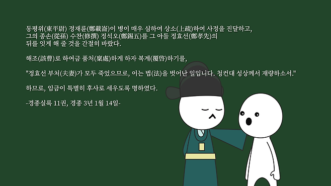 하지만 숙종은 허락하지 않았고, 의빈이 재혼할 수 없는 법을 제정했습니다. 어쩔 수 없이 정재륜은 종손(從孫) 정석오(鄭錫五)를 죽은 양자 정효선(鄭孝善)의 양자로 들여서 대를 이어나갔다고 합니다.
