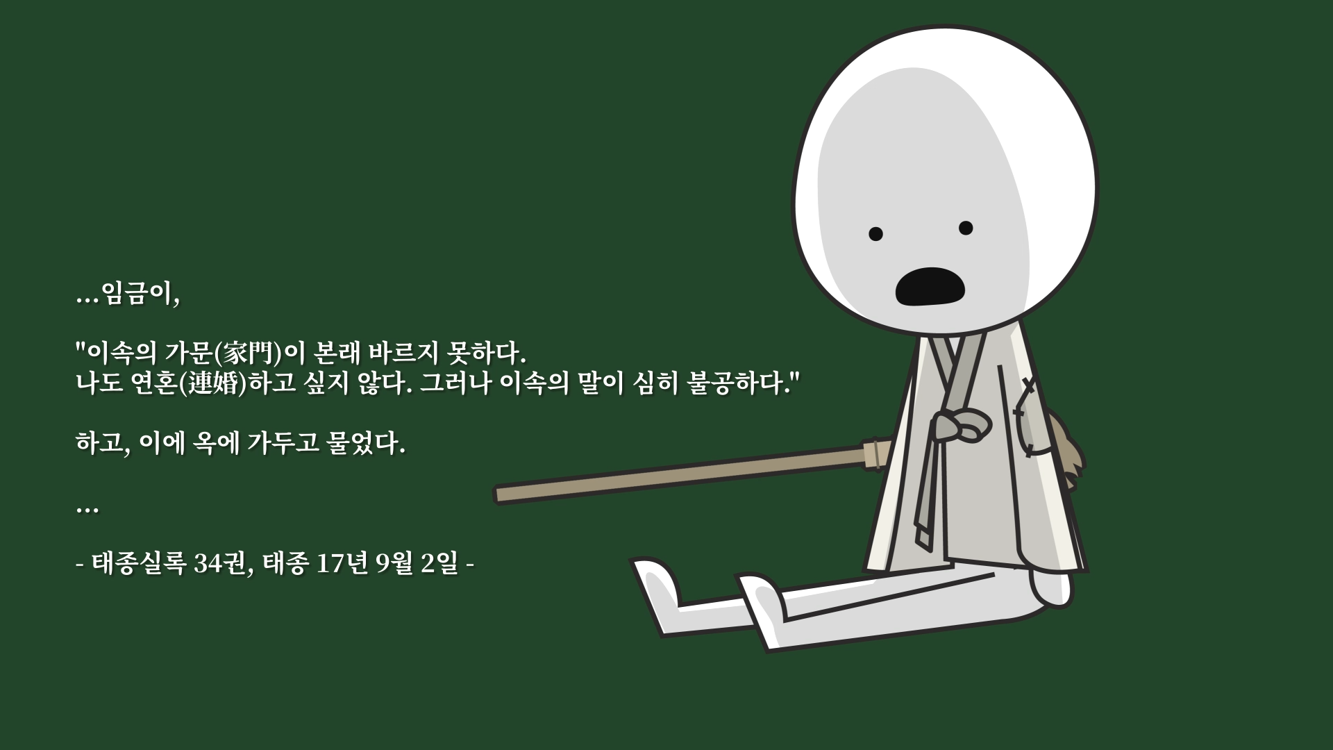 태종은 지춘천군사(知春川郡事)였던 이속(李續)의 아들을 정신옹주(貞愼翁主)와 혼인시켜서 의빈으로 삼으려고 했습니다. 이에 이속은 정신옹주의 생모인 신빈신씨(信嬪辛氏)의 출신(*태종의 후궁이자 정신옹주의 생모로 나인 출신이다.)을 들먹이며 거절 의사를 보였습니다.
