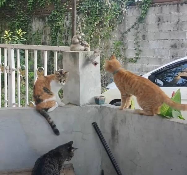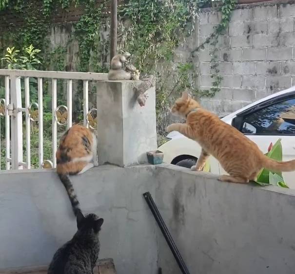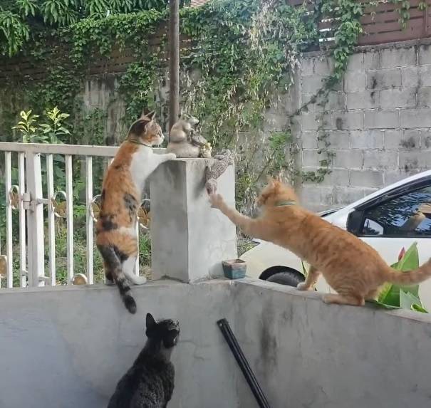 시간이 얼마나 흘렀을까요? 결투의 양상이 조금 많이 바뀌었습니다. 고양이가 친구들을 데려와 3:1의 싸움이 되었는데요. 자신감을 얻은 고양이는 힘차게 레프트 훅을 날립니다. 그렇게 주도권을 완벽하게 잡은 고양이 친구들. 그러나 도마뱀도 회심의 일격을 준비하고 있었습니다. 도마뱀의 공격에 당황한 고양이들. 그렇게 도마뱀과 고양이의 대치 상황은 이어졌고, 결말을 내지 못한 채 결투가 끝나죠.
