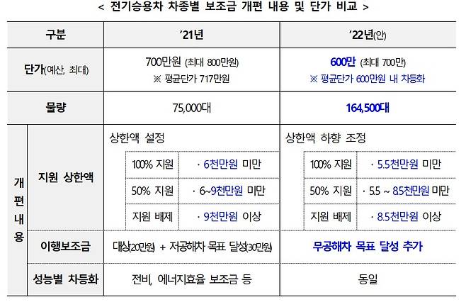 이날 정부는 전기차 보조금 체계를 개편할 예정이라고 밝혔다. 우선, 전기 승용차 구매보조금 지급 상한액을 현행 6000만원에서 5500만원으로 하향 조정한다. 구체적으로 5500만원 미만 전기차에는 보조금도 최대 700만원으로 낮추고, 5500만원~8500만원은 50%, 8500만원 이상 전기차에는 보조금을 지급하지 않는다.