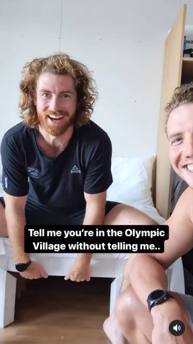 뉴질랜드 대표팀은 21일 공식 인스타그램에 도쿄올림픽 선수촌 침대가 구겨지는 영상을 올렸다. 조정 숀 커크햄이 침대 끝에 앉자 프레임이 찌그러진 것. 이에 커크햄은 물론 동료 마이클 브레이크는 너털웃음을 터뜨린다.