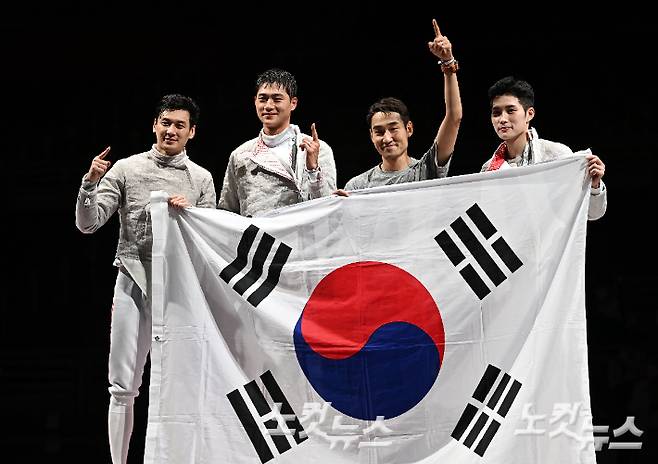 오상욱(25·성남시청), 구본길(32), 김정환(38·이상 국민체육진흥공단), 후보 선수 김준호(27·화성시청)가 나선 대표팀은 28일 일본 지바의 마쿠하리 메세에서 열린 도쿄올림픽 단체전 결승에서 이탈리아를 눌렀다. 9라운드까지 이탈리아를 45 대 26으로 완파했다.