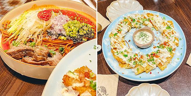 토요일 오후 2시, 한창 허기진 시간이자 절망하기 딱 좋은 시간. 특히 호족반 앞 예약 패드에 뜬 문구를 본다면 더욱 그렇다. ‘고객님 앞에 56팀의 대기가 있습니다.’ 이번 끼니는 고사하고, 오늘 안에도 입장하기 어렵겠다는 직원의 말에 발걸음을 돌리는 이들도 수두룩하다. 호족반은 2021년, 청담동 일대에서 가장 핫한 맛집이라고 소개해도 양심에 거리낌이 없을 정도다. 과연 이 정도의 웨이팅을 감수할 만할까 싶은데, 갓 구워져 나온 트러플 감자전 한 조각을 맛보는 순간 의심은 사라지고 용서는 시작된다. 얇게 채 썬 감자에 트러플 오일을 아낌없이 곁들였고, 특제 트러플 마요네즈 소스와 함께 바삭하게 구웠다. 적당히 느끼하고 알맞게 고소하다. 이 밖에도 퓨전 한식 전문점답게 들기름 메밀국수, 아보카도 한우 육회, 봉골레 칼국수 등 한식과 양식을 접목한 독특한 메뉴들이 많다. 하나같이 ‘못 먹어 본 맛’들이니, 어떤 메뉴를 택한대도 손실은 없을 것.