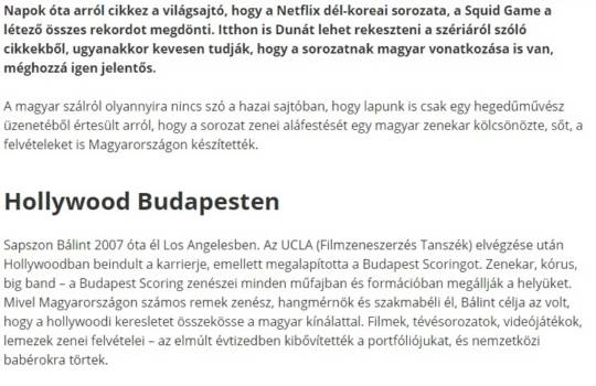 헝가리 내 언론사인 인덱스(index)는 이같은 사실을 '전 세계를 뒤흔든 오징어게임, 헝가리도 함께 만들었다'는 제목의 기사로 소개하는 등 오징어게임에 관련된 현지 언론의 보도도 이이지고 있다.