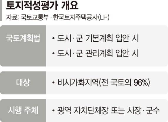이를 위해 국토부는 이런 내용을 담은 '토지의 적성평가에 관한 지침 일부개정'을 추진 중이다. 내년 1월 1일 시행을 목표로 다음달까지 행정절차를 마무리 짓는다는 복안이다. 토지적성평가는 도시관리계획 입안권자인 지자체가 도시관리계획을 입안하기 위해 실시하는 기초조사로, 난개발 방지 등 '선계획·후개발의 국토관리체계' 구축을 위해 기초계획 단계부터 토지이용계획 기준을 정하는 것을 말한다.