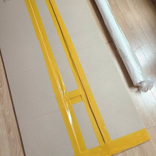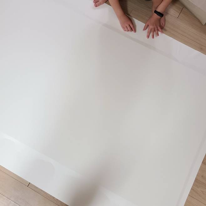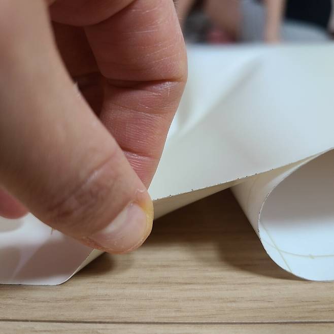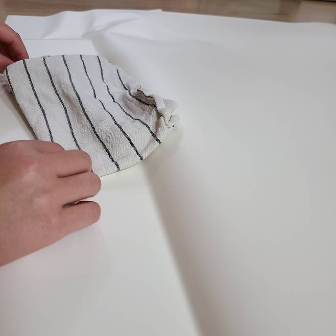 인테리어필름을 합판 크기에 맞추어 그저 붙이기만 하면 됩니다. 적당히 이형지를 접은뒤 뜯음과 동시에 마른걸레나 장갑으로 슥슥 문질러 붙여주면 끝!