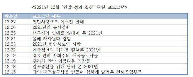 조선중앙TV는 12월 중순이 지나가면서 2021년 한해 각 부문의 성과를 정리하는 특집 프로그램을 방송했습니다. 올해를 총결산하는 특집프로그램들은 농업, 건설 및 건재(건설자재)공업 등의 산업부문 성과와, 재자원화 사례, 청년 활동, 모범 지역이나 인물들에 대한 칭찬과 경험공유 등의 내용을 아래 표와 같이 담고 있습니다. 특히 12월 27일 오후 약 20분 분량으로 방송된 ‘특집-인민사랑으로 이어진 한해’는 결산 방송의 종합판이라고 할 수 있습니다. 이 프로그램에서는 건설부문, 육아정책, 시·군 강화발전 등의 부문에서 이룩된 성과를 ‘김정은 위원장의 인민사랑 덕’이라고 선전했습니다.