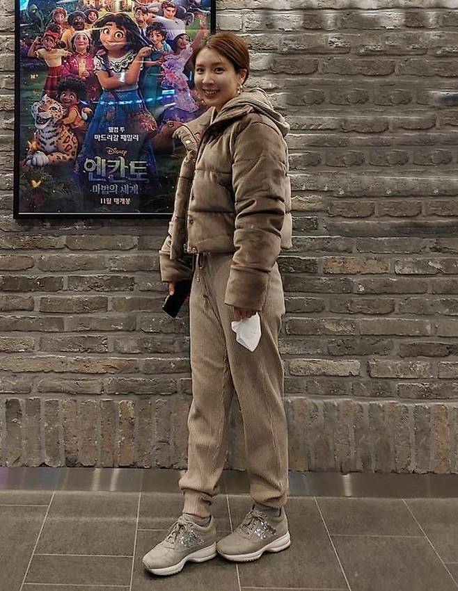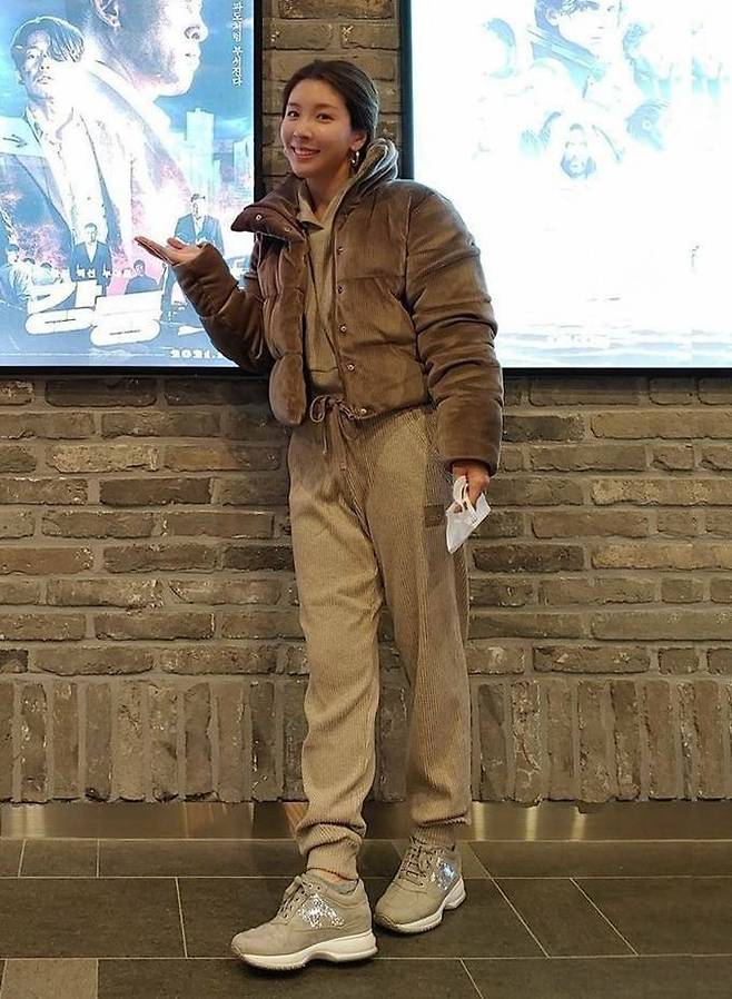 5. 오뚜기 3세 함연지는 영화관 나들이룩으로 후드 스웻 세트와 함께한 캐주얼하면서도 힙한 카키 크롭트 패딩룩을 선보였다.
