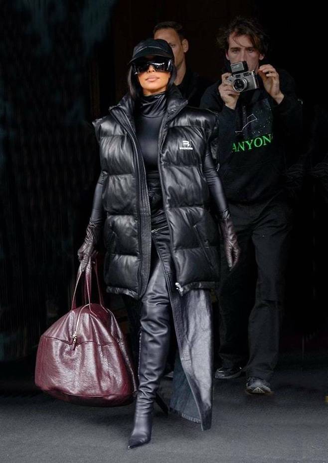 13. 킴 카다시안은 발렌시아가의 블랙 가죽 패딩과 가죽 랩스커트, 여기에 볼캡까지 올블랙 패딩룩으로 시크한 윈터룩을 연출했다.